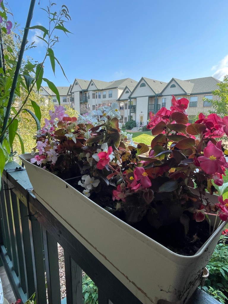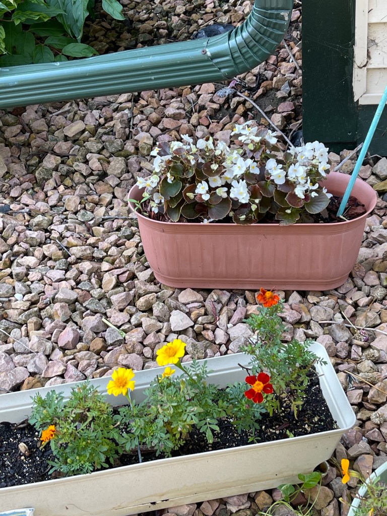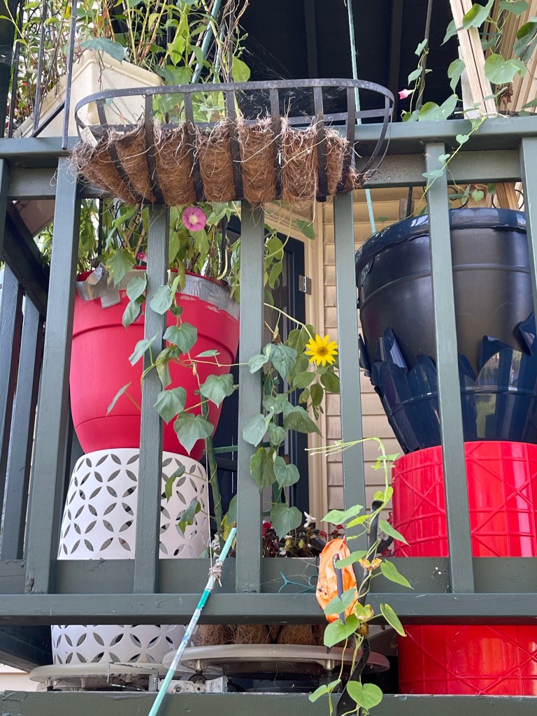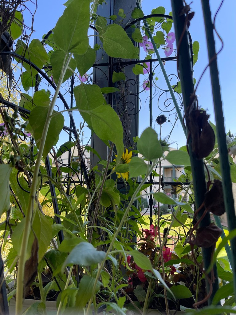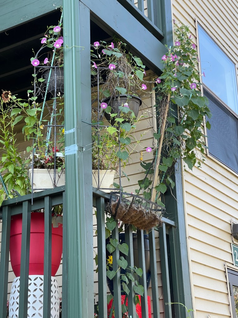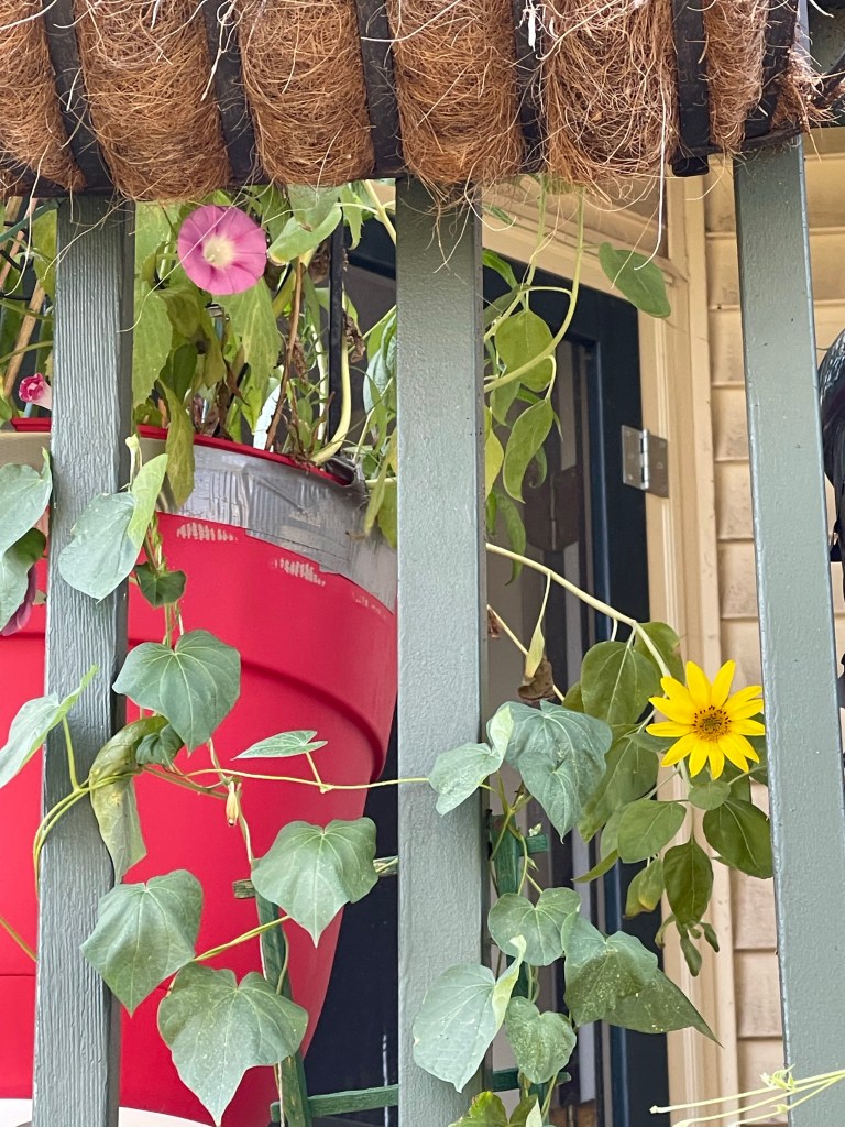 Sunflower unfurling Sunflower with Wild Grasses Sunflower with Morning Glories, begonias and grassesMorning Glories on their trellis close upFlower with garden native plants Portrait Zoom Out with blue skiesBegonias Rainbow in Window BoxMorning Glories blooming rear viewRainbow begonias in a pot near the porch railBegonias potOverview with pond and willow Ground potZoom outMorning Glories vining high and blooming Flowers finding the lightDahlia close upZoom out Front view of Morning Glories trellis in bloomMorning Glory and sunflower close upVolunteer Pansy close upBegonias and herb potFerns and grass potsMarigolds Marigolds and begonias Window boxes with Marigolds and Begonias Porch vining and pots zoom out