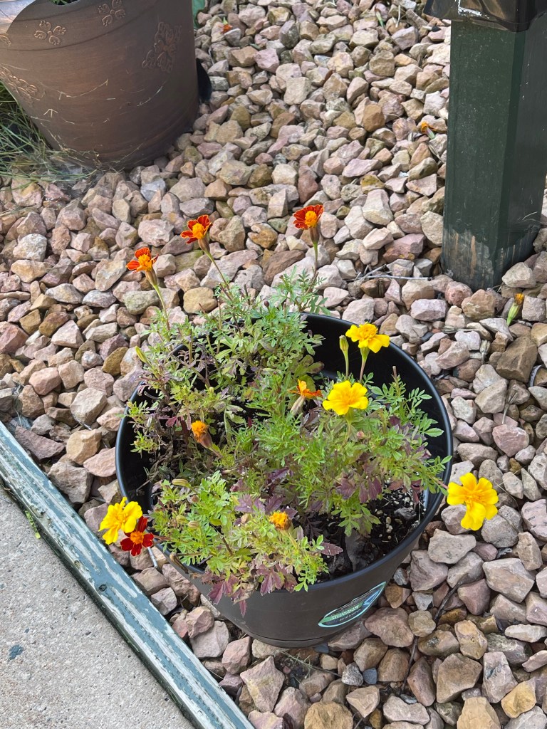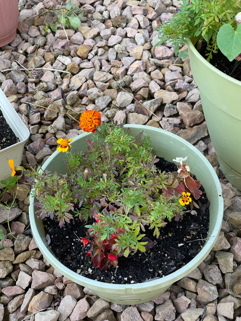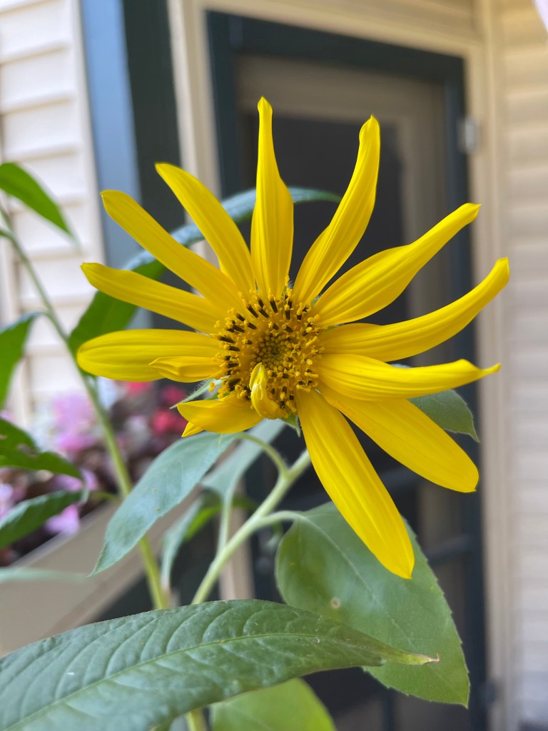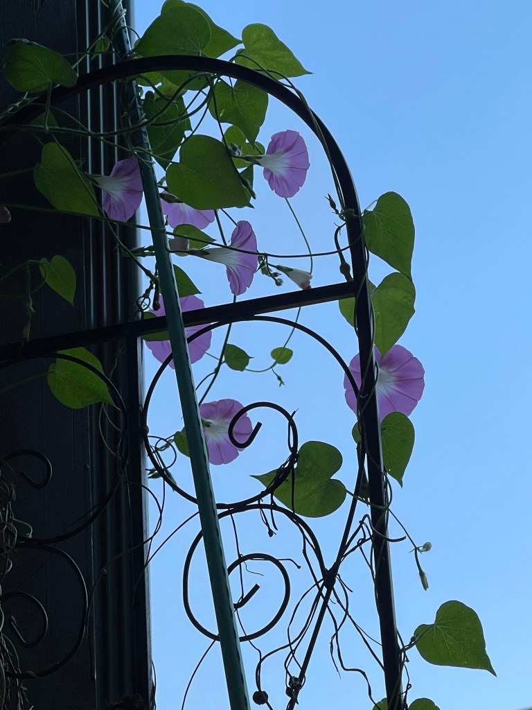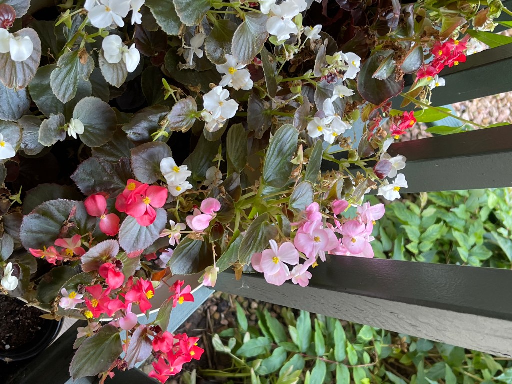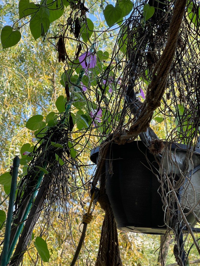 Sunflower unfurling Sunflower with Wild Grasses Sunflower with Morning Glories, begonias and grassesMorning Glories on their trellis close upFlower with garden native plants Portrait Zoom Out with blue skiesBegonias Rainbow in Window BoxMorning Glories blooming rear viewRainbow begonias in a pot near the porch railBegonias potOverview with pond and willow Ground potZoom outMorning Glories vining high and blooming Flowers finding the lightDahlia close upZoom out Front view of Morning Glories trellis in bloomMorning Glory and sunflower close upVolunteer Pansy close upBegonias and herb potFerns and grass potsMarigolds Marigolds and begonias Window boxes with Marigolds and Begonias Porch vining and pots zoom out